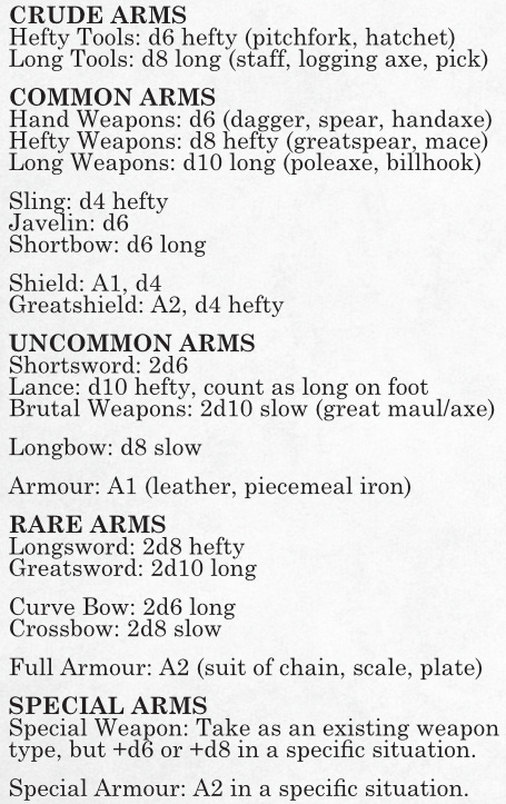 In Mythic Bastionland I wanted weapons to matter, but not too much. I wanted players to feel like their choice of weapon matters, but I didn’t want them to spend lots of time crunching numbers and weighing up options.