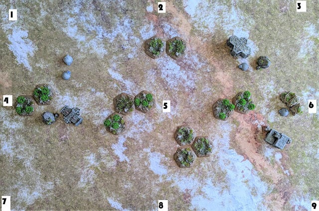 6: PatchThe Battlefield Marked with 9 potential deployment positions as per the scenario generator.